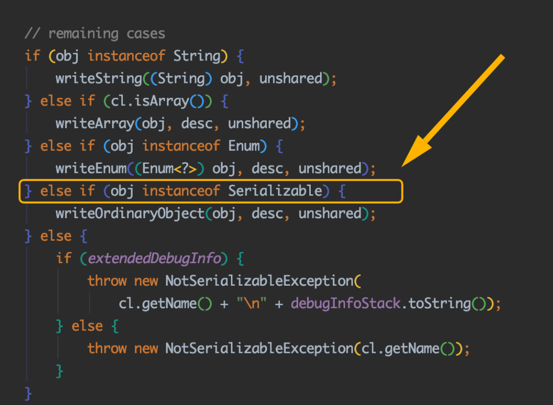 如果一个对象既不是字符串、数组、枚举,而且也没有实现Serializable接口的话,在序列化时就会抛出NotSerializableException异常!