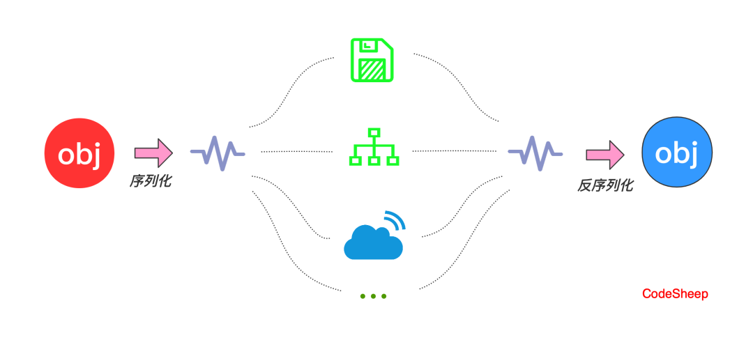 序列化的原本意图是希望对一个Java对象作一下“变换”,变成字节序列,这样一来方便持久化存储到磁盘,避免程序运行结束后对象就从内存里消失,另外变换成字节序列也更便于网络运输和传播,所以概念上很好理解: