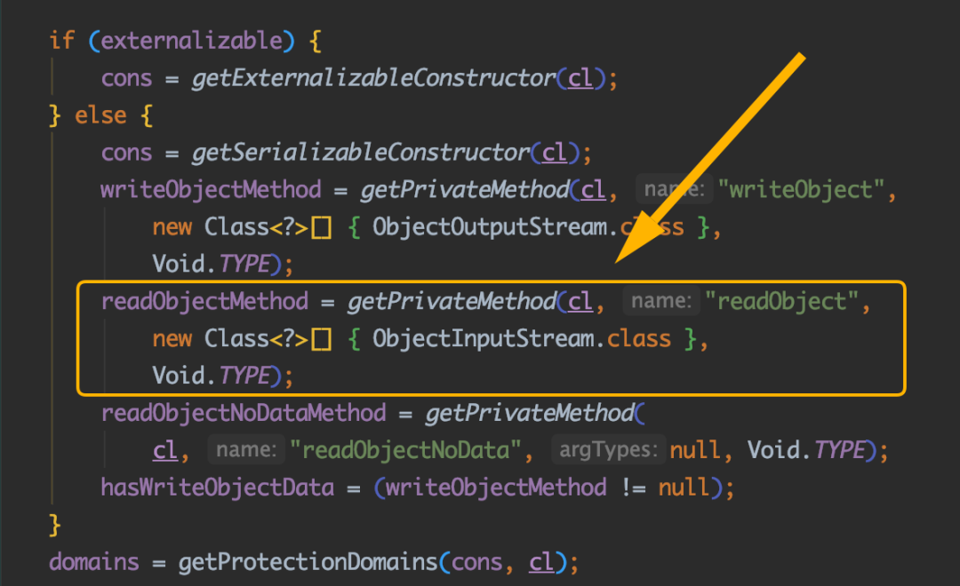 对于上面的代码,有些小伙伴可能会好奇,为什么自定义的private的readObject()方法可以被自动调用,这就需要你跟一下底层源码来一探究竟了,我帮你跟到了ObjectStreamClass类的最底层,看到这里我相信你一定恍然大悟: