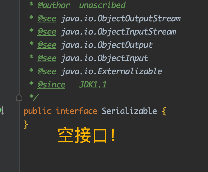上面在定义Student类时,实现了一个Serializable接口,然而当我们点进Serializable接口内部查看,发现它竟然是一个空接口,并没有包含任何方法!