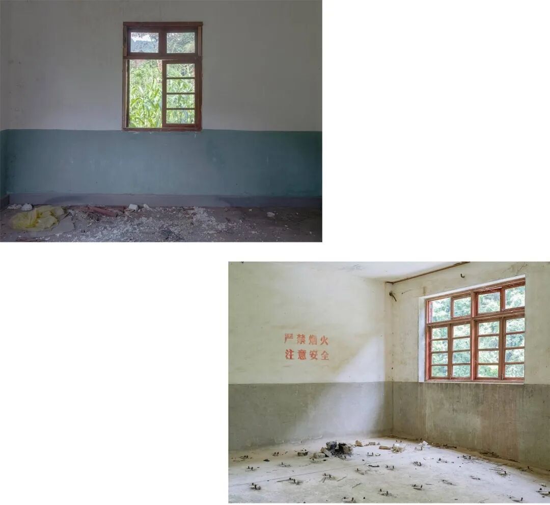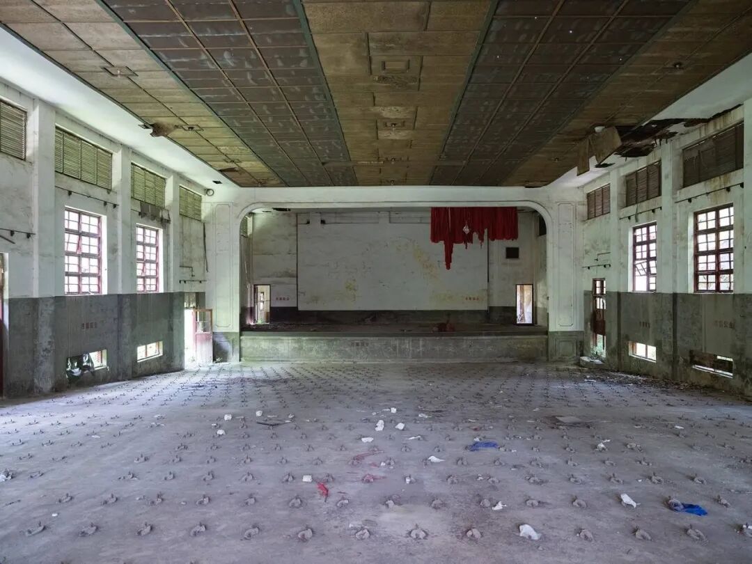 ●左图:汞矿住宅区中依然保留着人们生活的痕迹。右图:汞矿礼堂中的座椅如今已经被拆掉。