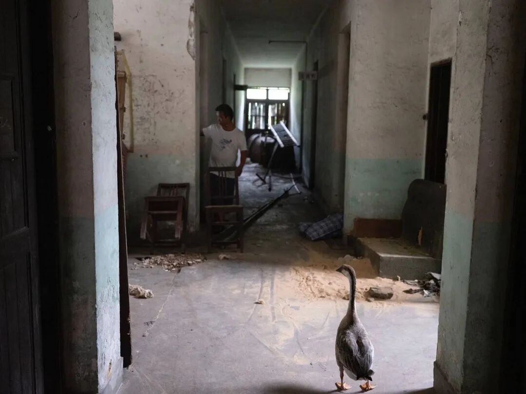昏暗的办公楼走廊中空气潮湿,有时散发出腐木味,杨世贵端着前晚的剩饭蹲在这里,敲了几下饭盆。不一会儿一只灰鹅从门外走到他身前,垂下脖子开始进食。