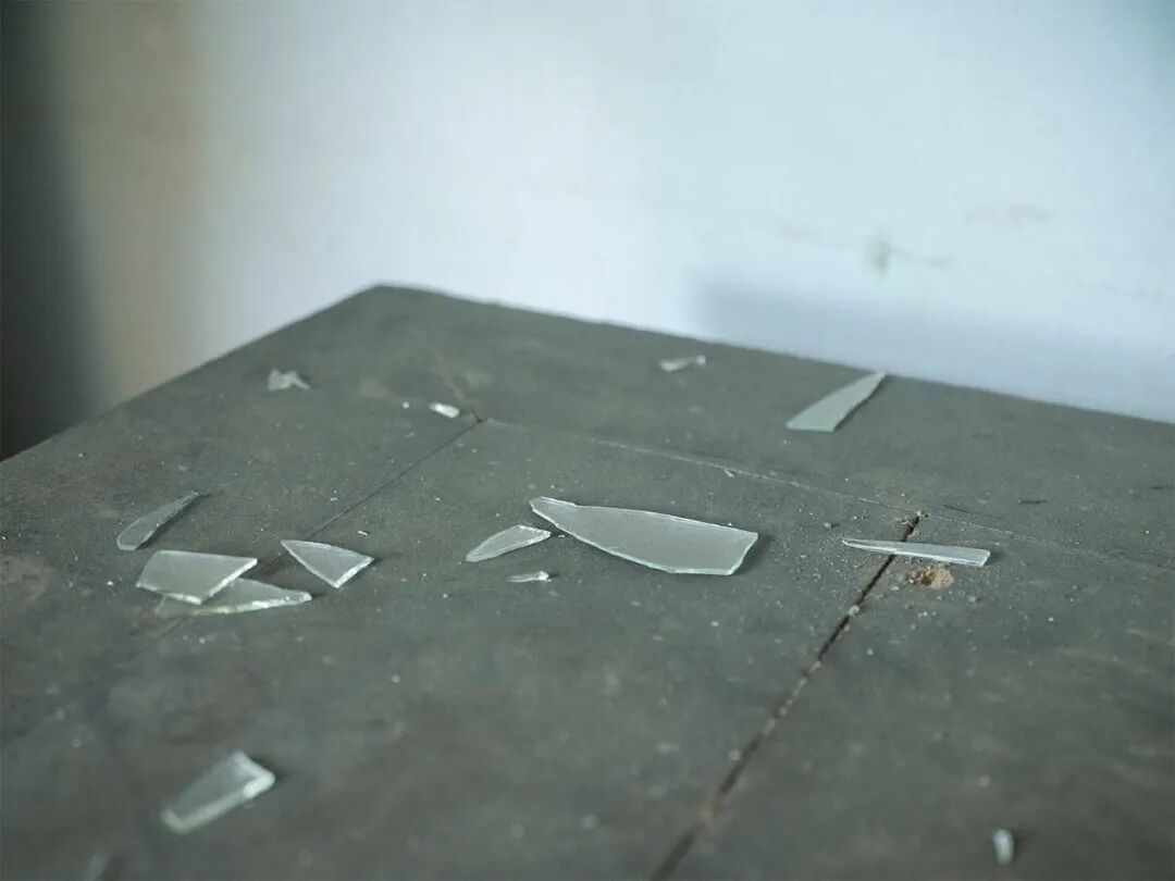 ●在汞矿住宅楼中,遗弃的桌子上散落着玻璃碎片。