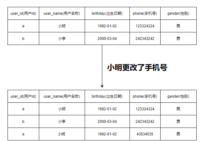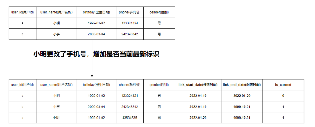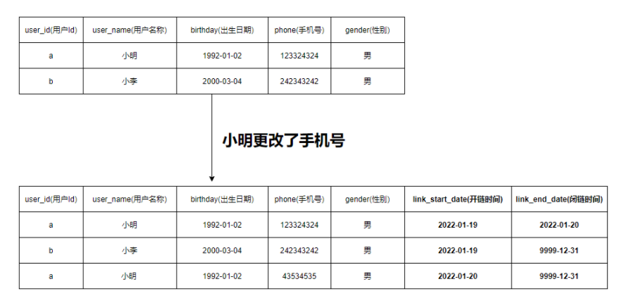 如下图所示,小明突然换了手机号,但是又需要把以前的手机号给存储下来,那么请问在表结构上怎么设计?数据该怎么存?难道真的像图中那样直接进行追加吗?那你可是真会玩。当然这种问题是属于SCD的范畴,如果你学过SCD,那么就会知道其中一种处理手段就是使用拉链表。也就是采用如下图的方式: