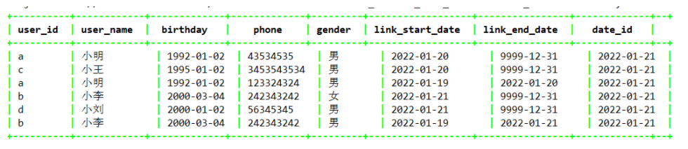 如果2022-01-21号又新增了一个小刘用户,同时小李更改了性别,那么经过上面的代码逻辑可以得到如下图的结果: