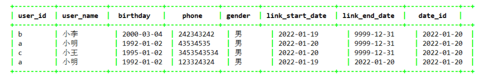从上述中的数据层面和场景结合介绍了拉链表,那么本小节从工程方面来实操一下拉链表的生成。示例 :2022-01-19进行拉链表初始化,2022-01-20号小明发起了更改手机号的操作,同时新增了小王用户。表格式如下: