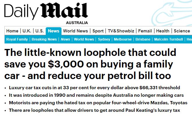 举例来讲,如果有司机买了马自达CX-9或者丰田克鲁格等热门顶配四轮驱动车,就需要缴纳3000澳元的豪车税。