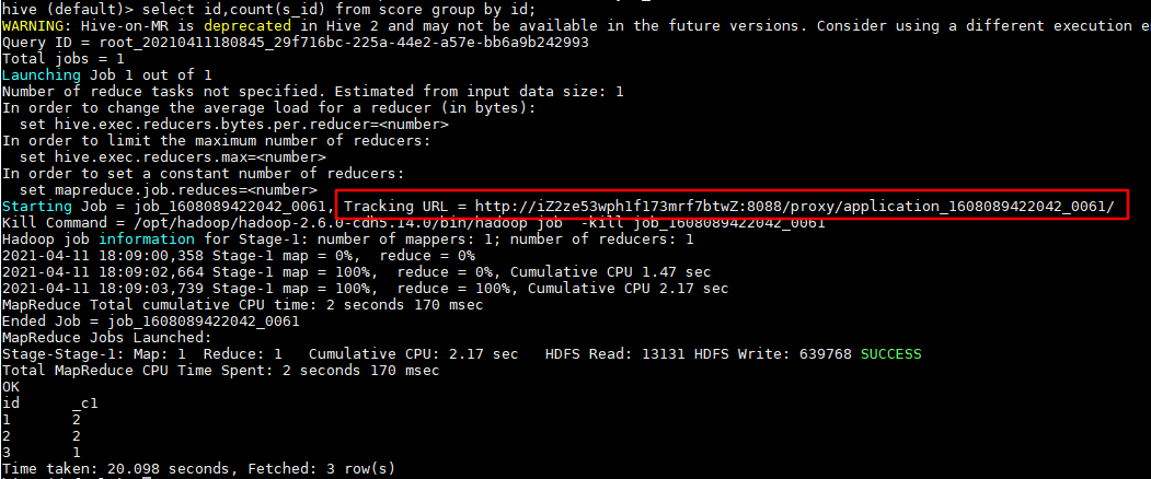 想要知道HiveSQL所有阶段的运行信息,可以查看YARN提供的日志。查看日志的链接,可以在每个作业执行后,在控制台打印的信息中找到。如下图所示: