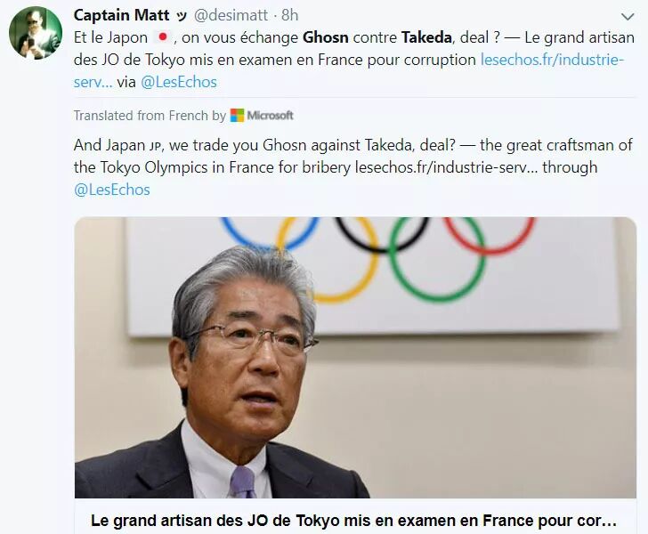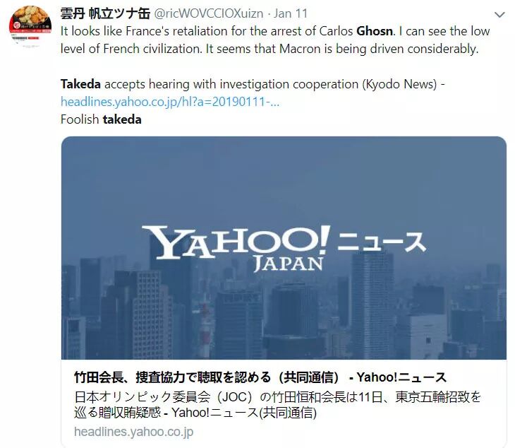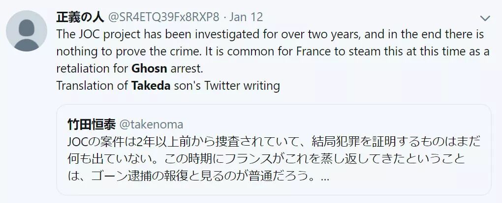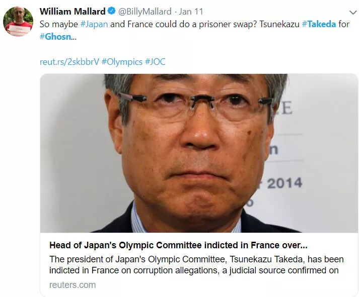 “法国人已经对竹田恒和调查2年了,却选在这两天对他起诉,这很可能就是在报复戈恩的案子”,一位参与东京2020奥运会工作的日本官员就对日本《每日新闻》这样控诉到。