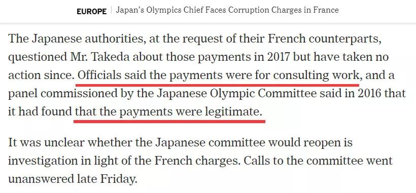 美国《纽约时报》的报道也显示,身为日本明治天皇曾孙的竹田恒和,其实早在2016年时就已经被日本方面应法国检方的要求询问过此事。但日方调查后却告诉法国方面这笔钱是合法的咨询费用,日本奥委会也表示这笔钱用途合法,不是行贿。