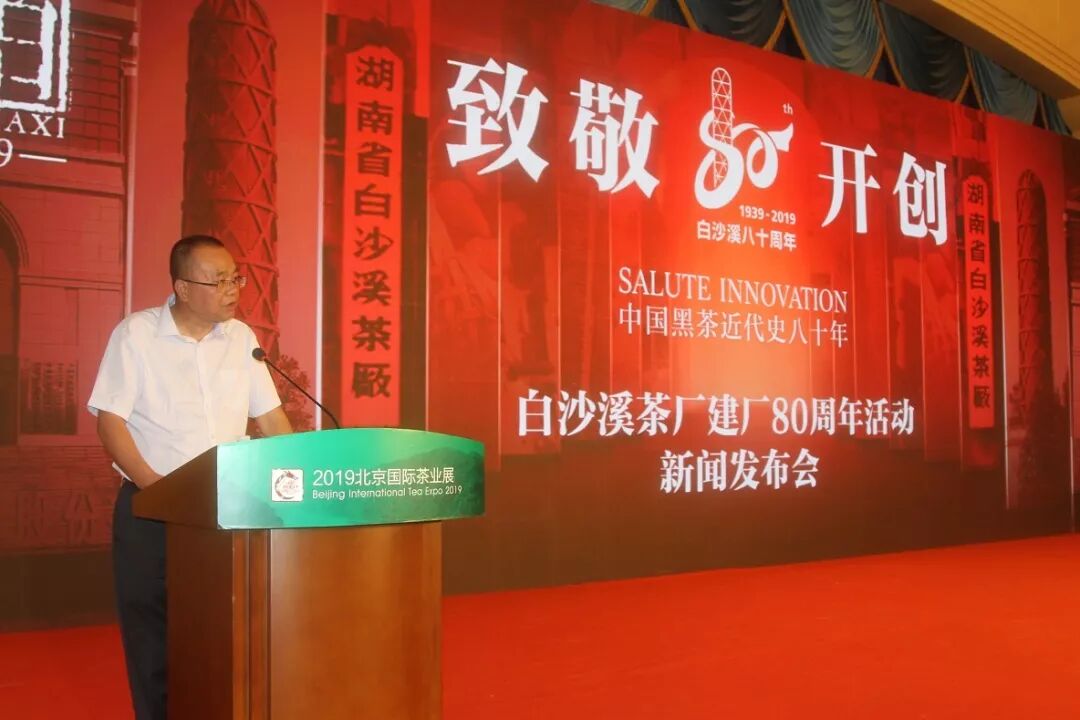 2019年是新中国成立70周年,同时也是湖南省白沙溪茶厂股份有限公司建厂80周年。值此之际,“湖南省白沙溪茶厂股份有限公司建厂80周年新闻发布会”于6月23日下午在“两展一节”期间成功召开。中国茶叶流通协会会长王庆,北京市西城区委常委、政法委书记、统战部长王旭,中华合作时报社党委书记、社长、总编辑查迎新,湖南省安化县人大常委会副主任、县茶旅产业发展领导小组副组长肖伟群,中国茶叶流通协会监事长、湖南省茶业协会会长、湖南省白沙溪茶厂股份有限公司董事长周重旺,中国茶叶流通协会副会长、北京市茶业协会会长白文祥,中国作家协会会员、中国作家协会办公厅主任李一鸣,湖南省白沙溪茶厂股份有限公司总经理刘新安等相关领导,企业、消费者及媒体代表共计300余人参加了发布会。