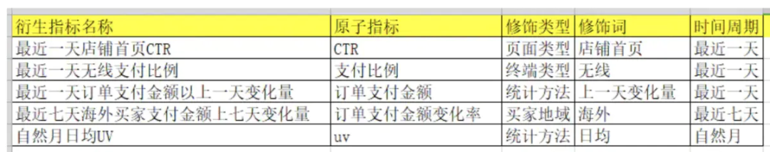 派生指标:原子指标+多个修饰词(可选)+时间周期。