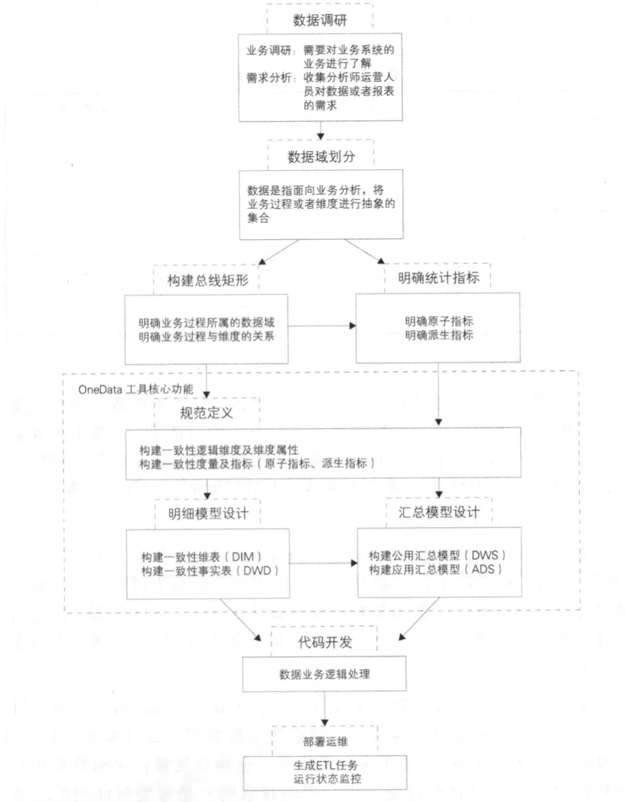 其实施流程主要分为:数据调研、架构设计、规范定义和模型设计。