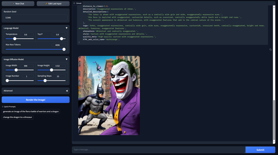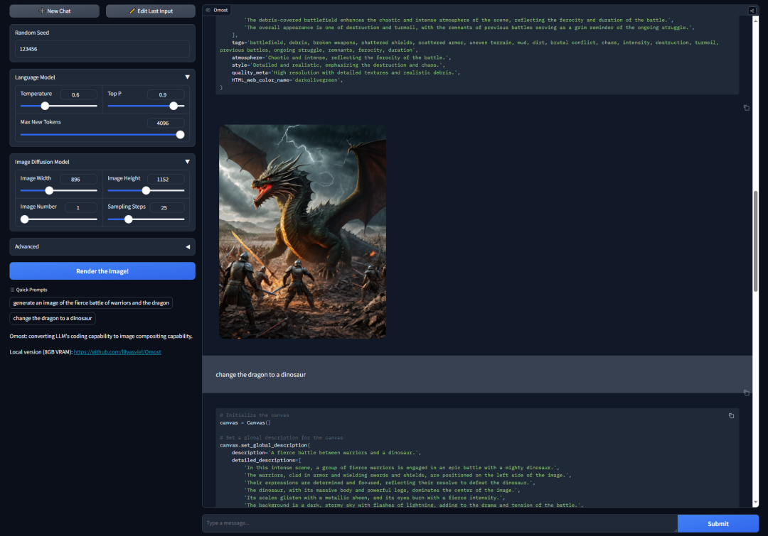 该项目基于 LLM 的编程能力帮用户自动完善文生图的提示词,可以根据用户输入的简短提示词生成高质量的图片,还支持图片局部修改等功能,比如将图片中的龙变成恐龙,极大地降低了编写文生图的门槛,无需复杂的提示词即可生成满意的图片。