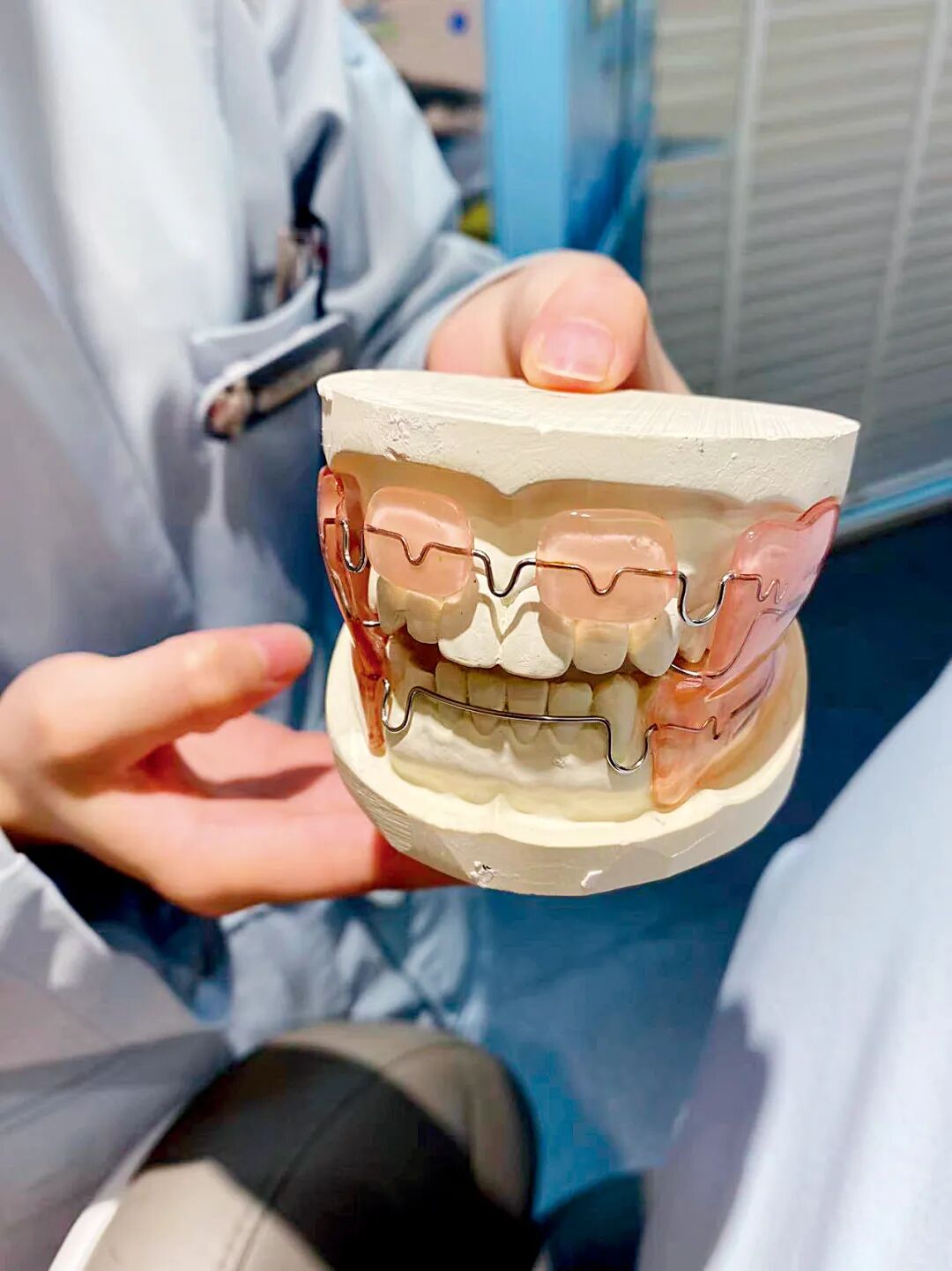 卷卷三岁四个月的时候,就戴上了牙套。那是一种可取下的活动牙套,学名叫双曲舌簧颌垫矫治器。妈妈何彩忧心女儿的下牙覆住了上牙,这种症状通俗的叫法是“地包天”,学名叫“反颌”,她把矫治器卡在女儿上颌牙里面,每天让她坚持佩戴12个小时,睡眠时也尽量不摘下。