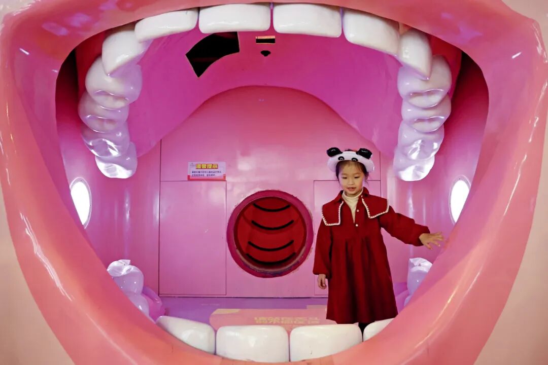 2021年2月6日,一名小朋友在福建厦门科技馆的口腔模型内玩耍。图/新华