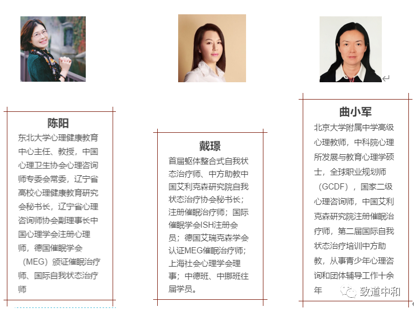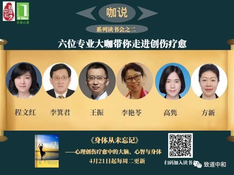 如果说哈德曼老师对创伤的理解是一个大花园的话,他今天只摘了一片小叶子展示给大家。哈特曼老师非常强调《身体不会忘记》这本书,在全世界范围内的创伤领域都具有影响力,所以我们致道中和将要举办《身体不会忘记》系列读书会(这也是我们的系列读书会之二,创伤篇),有幸邀请到多位创伤学的大咖,分别是王震老师、李箕君老师、李艳苓老师、高隽老师、程文红老师。各位老师的具体介绍,大家可以看读书会的推文。