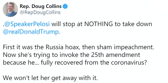 川普的铁杆盟友们也开始回击,佐治亚共和党众议员Doug Collins就列数了佩洛西这三年多来的若干次想要把川普拉下台的努力:首先是通俄门,然后是通乌门弹劾,现在又搞25修正案。