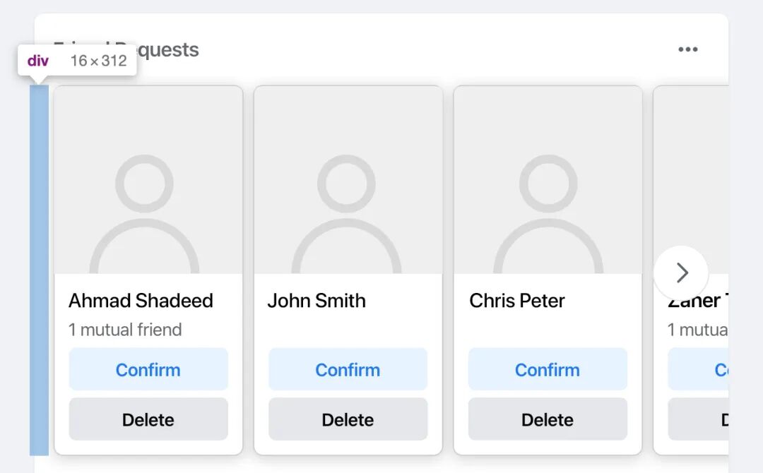 我在这里加上一些背景,上面是在主页Feed中随机出现的好友请求部分。有一个人的网格,并且此网格有左边距。通常,我将通过 margin-left:16px 来执行此操作。但是,Facebook添加了<div> 作为容器边缘和网格之间的空间。