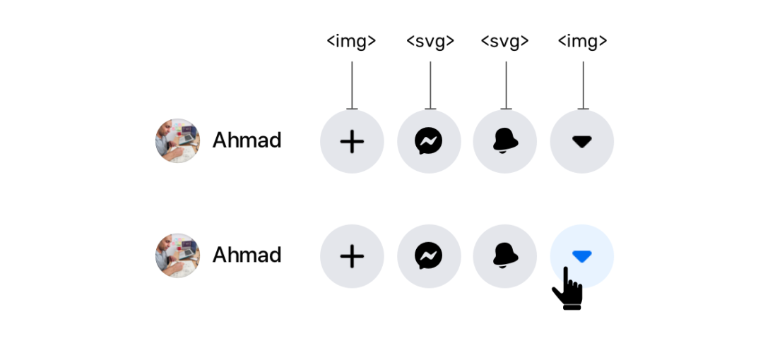 您看到那里的四个图标了吗?加号和箭头是图像,而Messenger和通知则是SVG元素。我不知道这种混合背后的原因是什么。