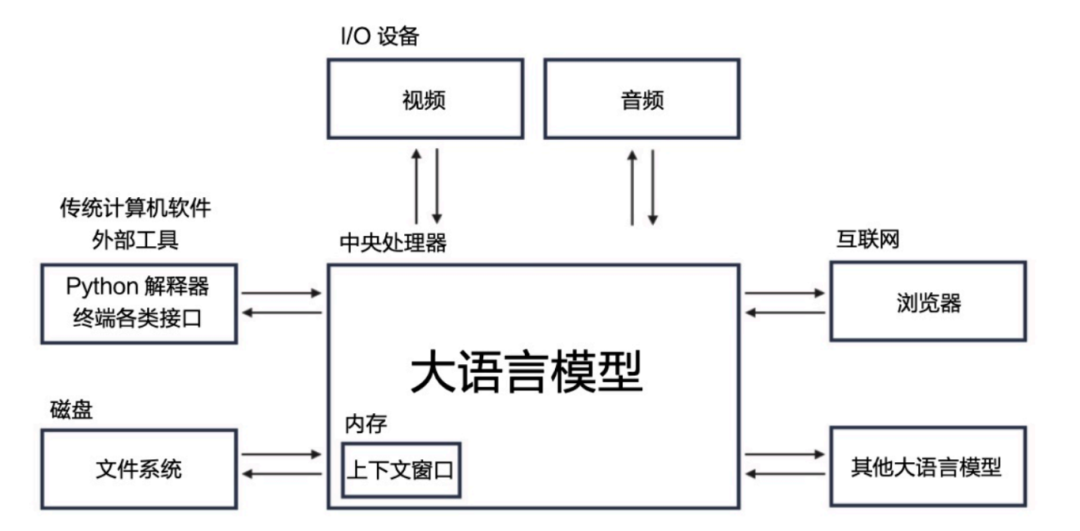 外部数据在语言模型中扮演着长期记忆的角色,类似于计算机的磁盘。这些外部数据的组织方式就像计算机磁盘中的文件系统一样,它们存储和管理着模型需要的信息,供其随时调取。此外,语言模型接收和输出的文本、音频、视频相当于计算机的输入输出设备,它们是模型与外界交互的媒介。