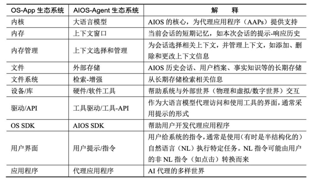 在这篇论文中,作者提出了 AIOS-Agent 生态系统的概念,并将其与现今的操作系统(OS) -应用程序(App)生态系统进行了比较。下面展示了它们之间的类比关系。