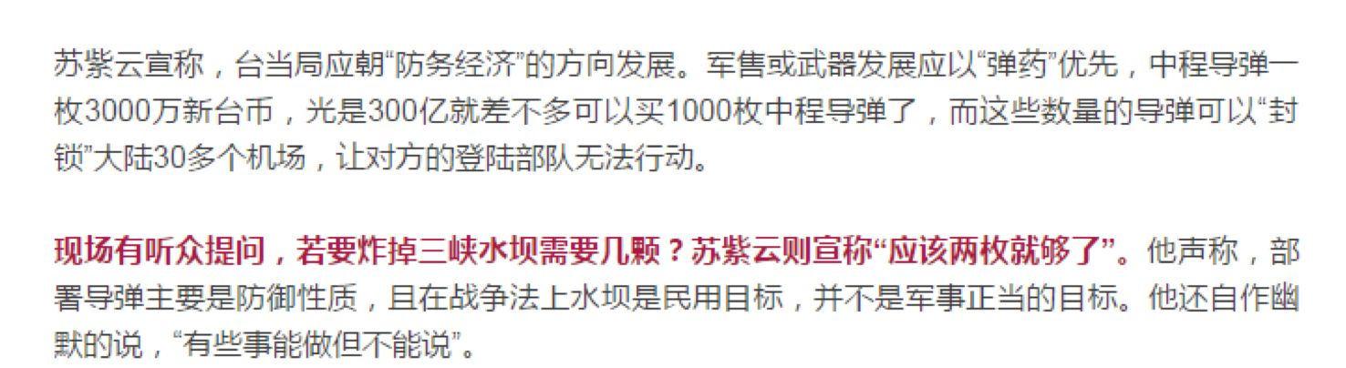两天前,环环(ID:huanqiu-com)做了一篇报道,说台湾淡江大学整合战略科技中心执行长苏紫13日在公开演讲中建议台当局,花300亿新台币买1000枚中程导弹,“就能封锁中国30多个机场”。现场有人好奇问,炸掉三峡大坝需几枚导弹?苏回答:两枚就够了。(详情请戳:猝不及防!台海对岸突然打来新年第一炮!)