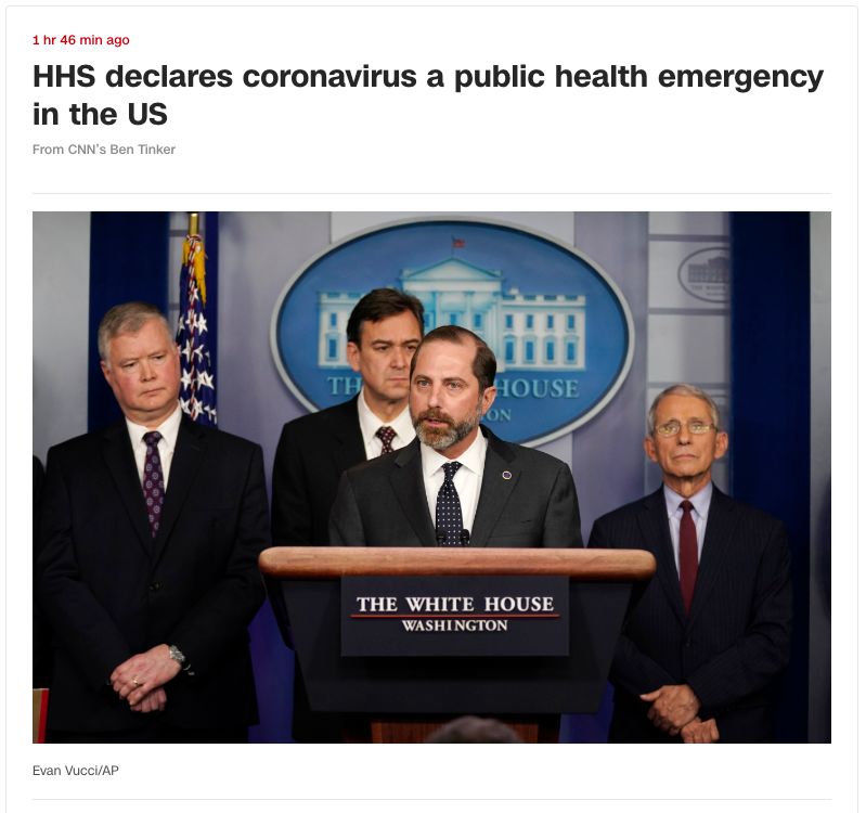 美国卫生与公众服务部部长阿莱克斯·阿扎(AlexAzar)宣布此次冠状病毒爆发为公共卫生紧急状态,