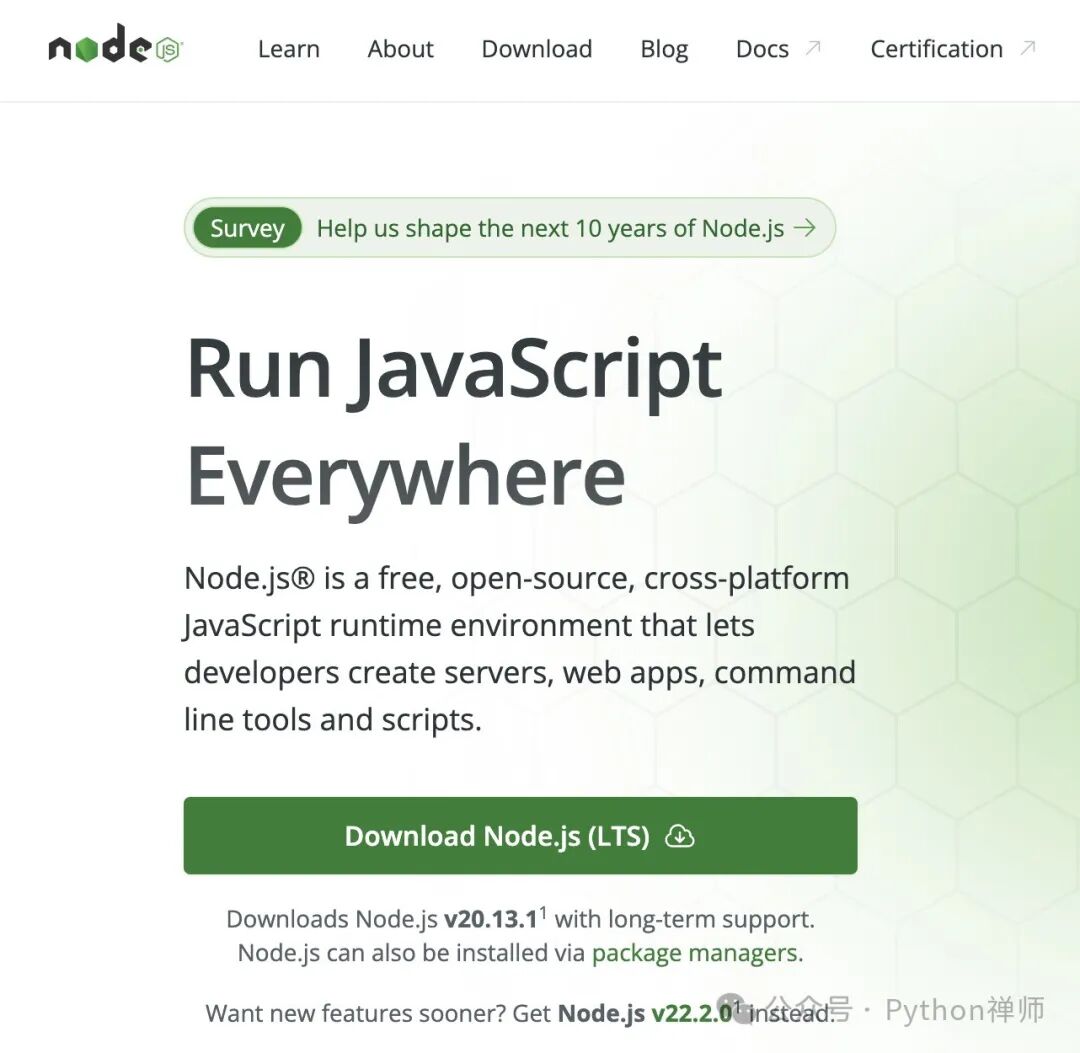 安装完成之后,可以验证一下 Node.js 的版本,建议用目前的最新v20版本: