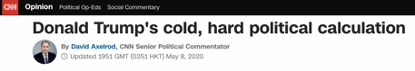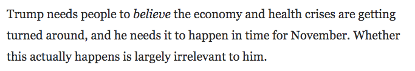 特朗普需要人们相信经济和健康危机正在好转,他需要这在11月(大选投票)前发生。至于经济和健康危机是否真能好转,他并不关心。
