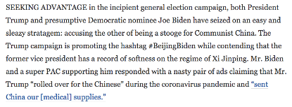 为了在竞选初期占据优势,特朗普总统和民主党预先推定的候选人乔·拜登都毫不犹豫地采取了一个轻松而卑鄙的策略:指责对方是中国的走狗。特朗普的竞选团队正在推广“北京拜登”的话题标签,同时声称这位前副总统对中国素来温和。拜登和支持他的一个超级政治行动委员会则用令人生厌的广告予以回应,称“特朗普在新冠病毒疫情中‘听命于中国人’,并‘把我们的(医疗)物资送给中国’”。