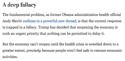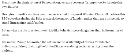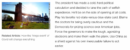 总统进行了冷酷、无情的政治计算,并决定选择那条自私之路。他将不惜一切代价站在重新开放的一边。打着他最喜欢的红蓝州大选牌,责怪医生过度谨慎,批评民主党把科学凌驾于美国人民的生计之上。迫使州长们做出艰难、痛苦的决定,并为此背上黑锅。把中国作为绝佳的盾牌,来掩饰自己无法令人原谅的迟缓行动。