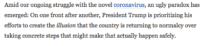在我们与新型冠状病毒的持续斗争中,出现了一个丑陋的悖论:在一个接一个的战线上,特朗普总统都在努力制造一种幻象,即美国正在恢复正常状态,而非采取具体可行的措施真正做到这一点。