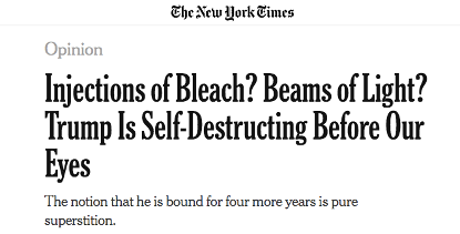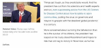 成千上万的美国人在死去,而总统做了什么呢?散布不实信息。传播错误希望。重新创造历史,重新幻想科学,对自以为是的英雄主义喋喋不休,抱怨自己所做的牺牲以及攻击任何质疑他的人。没有领导力,只有哗众取宠。没有共情,只有窃笑。就这样,他还想要连任。
