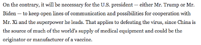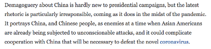 在总统大选中,借对中国炒作并不是什么新鲜事,但在疫情期间,这些言论尤其不负责任。在亚裔美国人已经遭受不合理的攻击之时,它把中国和中国人民描绘成敌人,这可能使与中国的合作更加复杂化,而这种合作对于打败新冠病毒是必不可少的。