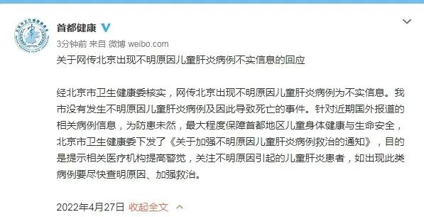 针对种种传闻,4月27日下午,北京市卫生健康委员会官方微博发文称,经北京市卫生健康委核实,北京市没有发生不明原因儿童肝炎病例及因此导致死亡的事件。