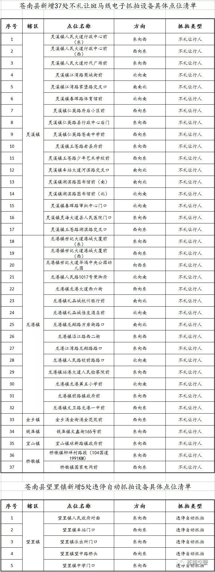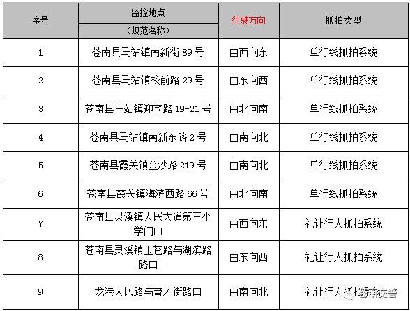 为了进一步规范苍南县道路交通技术监控设备的设置工作,根据《道路交通安全违法行为处理程序规定》(公安部105号令)的相关要求,结合苍南县道路交通实际,现就我县新增37处不礼让斑马线电子抓拍及望里镇新增5处违停自动抓拍设备的安装地点、功能作用等全面系统地向社会公布。新增的42处监控设备自2018年1月5日正式投入使用。
