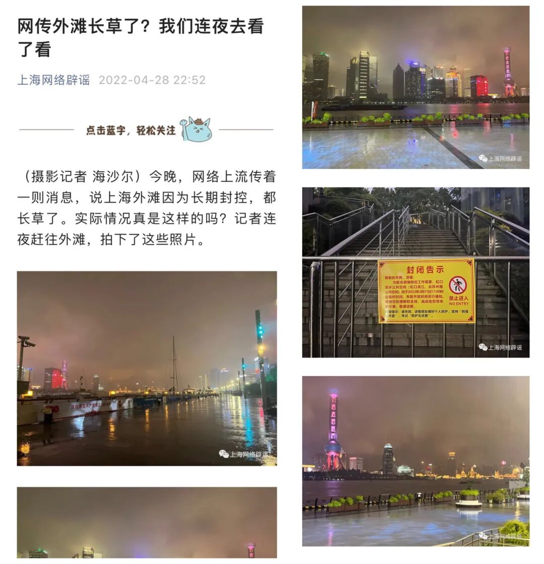 昨天晚上,“上海网络辟谣”发布信息《网传外滩长草了?我们连夜去看了看》。该辟谣内容发了多张实拍照片,告诉读者外滩没长草。