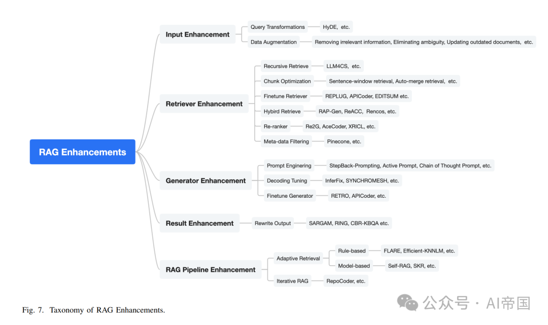 这里将介绍增强 RAG 性能的方法。论文根据它们的增强目标将现有方法分为 5 个不同的组别:输入、检索器、生成器、结果和整个流水线。
