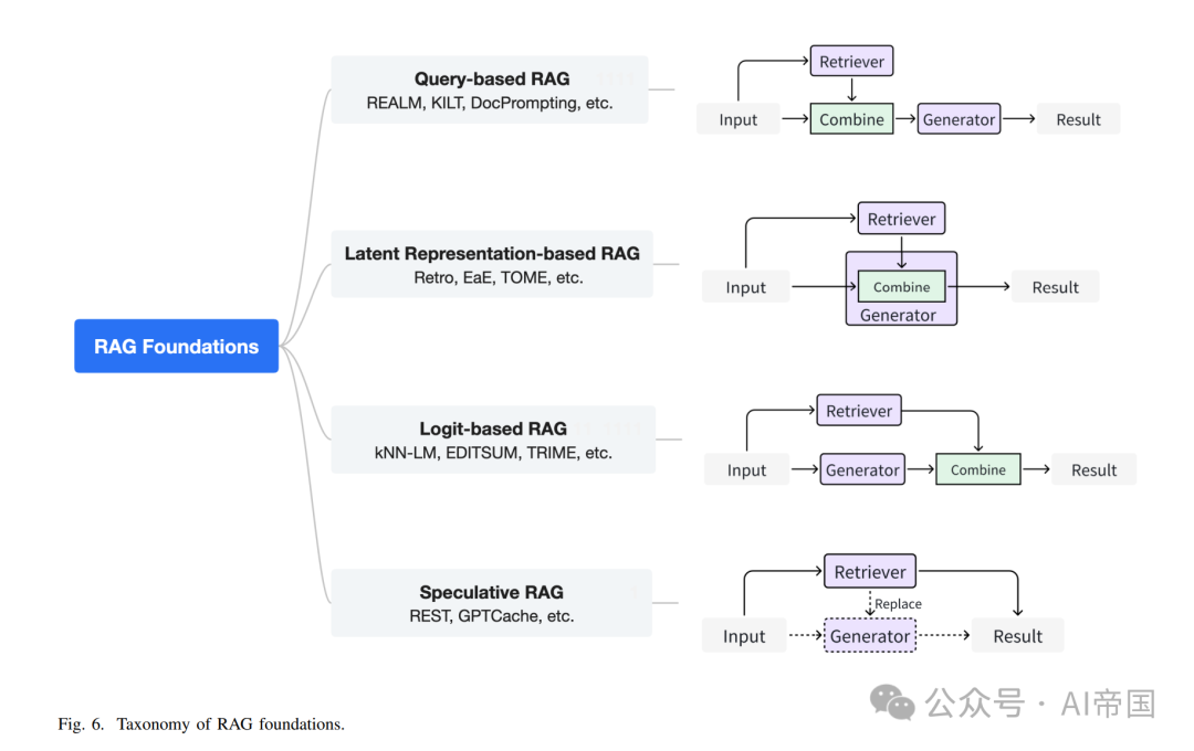 2)基于潜在表示的RAG: 在基于潜在表示的RAG框架中,生成模型与检索对象的潜在表示交互,从而增强了模型的理解能力和生成内容的质量。