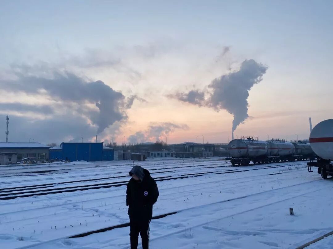 演出的第二天,我跟着呼兰去拍了东北之行纪录片的结尾。那是在一个炼油厂附近,远处的天空被落日洒下了一抹粉色,近处三个巨大的烟囱吐出的浓烟印在上面,眼前还停着几排看不到头的油罐火车,一个特别东北的场景诞生了。