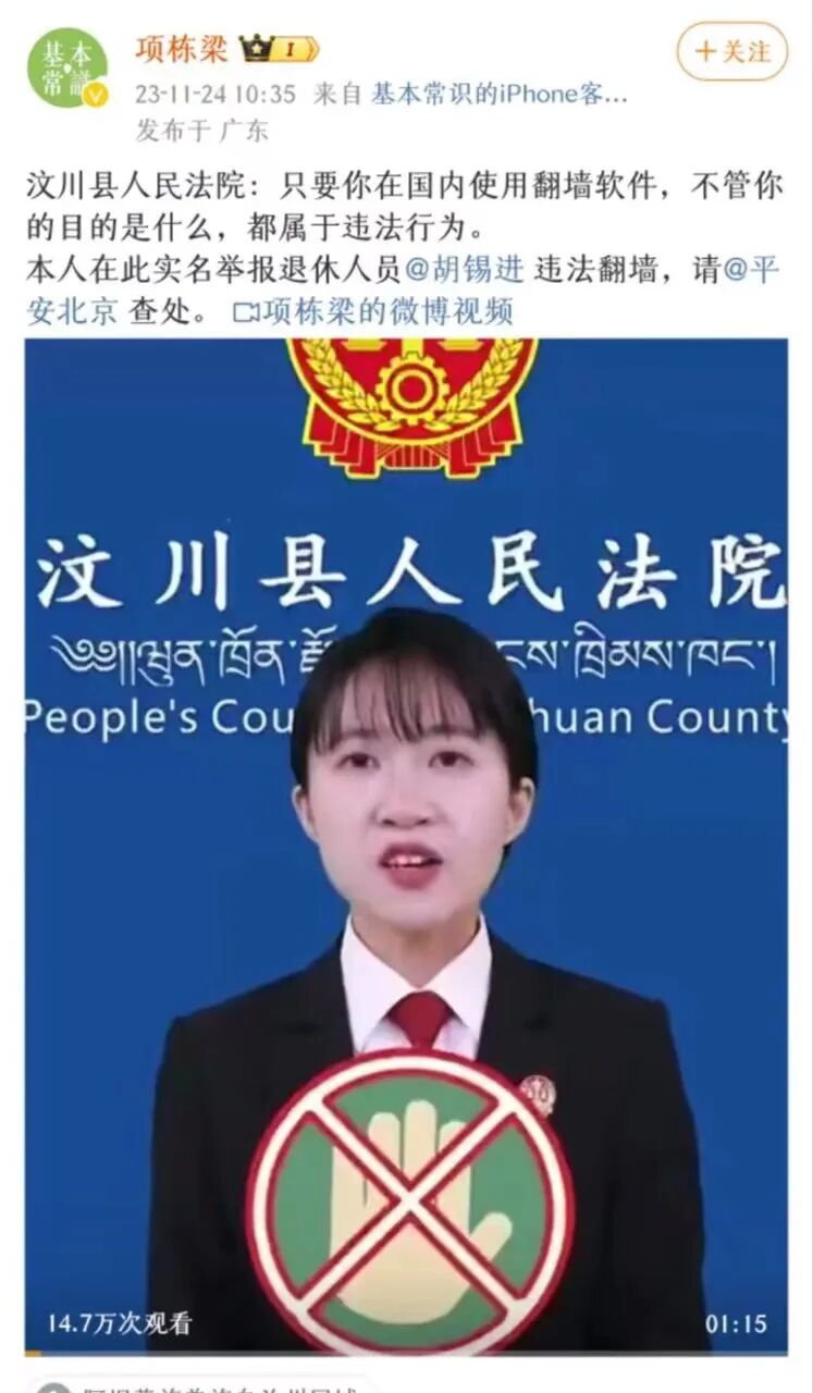 如果翻墙上网不犯法,那汶川县法院作为国家司法机关就传播了错误的法律知识,严重伤害了法律的严肃性,那他们应该澄清道歉,我的微博属于辟谣有功。