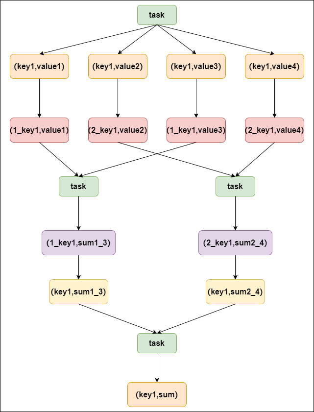 首先,通过map算子给每个数据的key添加随机数前缀,对key进行打散,将原先一样的key变成不一样的key,然后进行第一次聚合,这样就可以让原本被一个task处理的数据分散到多个task上去做局部聚合;随后,去除掉每个key的前缀,再次进行聚合。