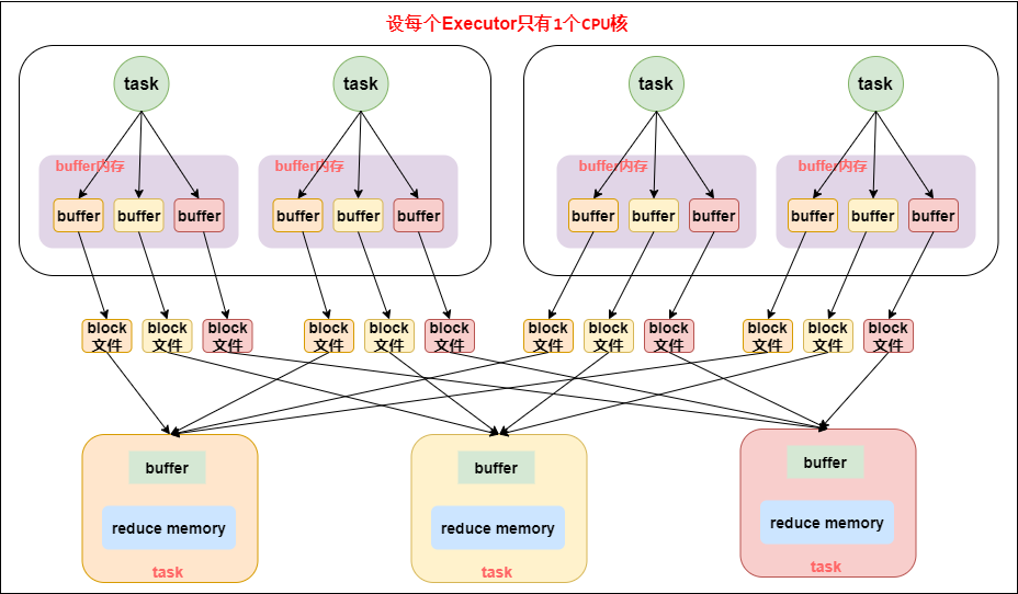 下一个stage的task有多少个,当前stage的每个task就要创建多少份磁盘文件。比如下一个stage总共有100个task,那么当前stage的每个task都要创建100份磁盘文件。如果当前stage有50个task,总共有10个Executor,每个Executor执行5个task,那么每个Executor上总共就要创建500个磁盘文件,所有Executor上会创建5000个磁盘文件。由此可见,未经优化的shuffle write操作所产生的磁盘文件的数量是极其惊人的。