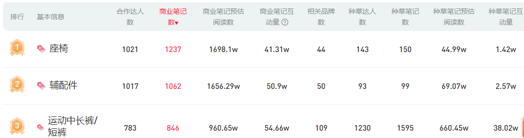 根据新红数据,2023年3月,小红书商业笔记数量排名前十位的商品,均与美妆护肤相关。其中液态精华排名第一,商业笔记数量达到了1.2万。而将目光定位在运动户外分类中,即使排名第一的“座椅”类商品,笔记数也仅有1237条。