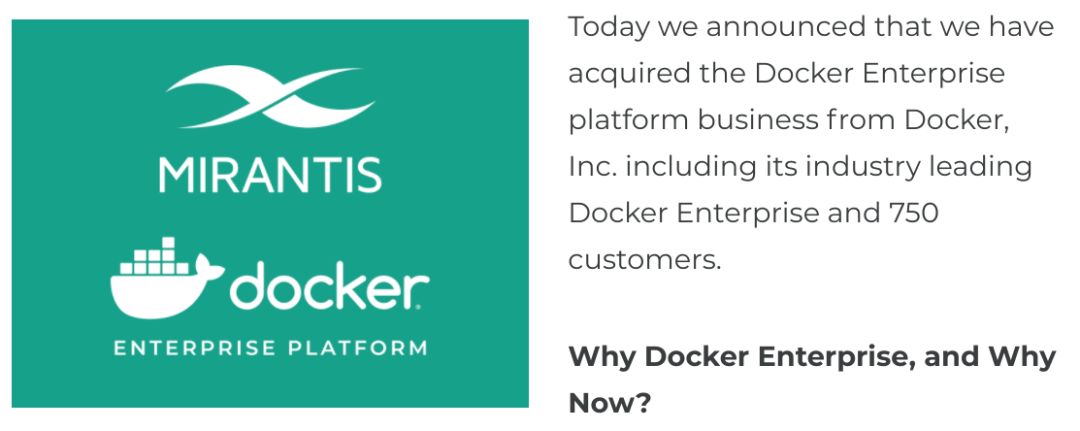 2019年11月13日,私有云基础设施公司Mirantis在其官方博客宣布,收购Docker公司企业级业务,包括接管它的700多个客户,这标志着Docker公司从2013年开始的商业化探索彻底失败。