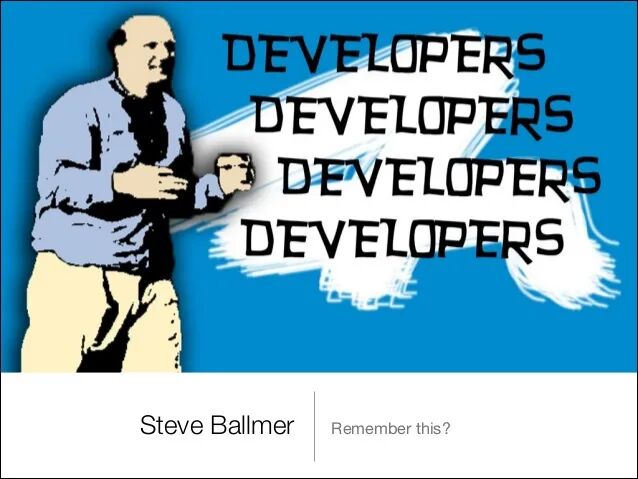 或许你还记忆犹新,微软的上一任CEO史蒂夫∙ 鲍尔默曾经在一次大会的演讲中“表演”了一段煽情的个人show,他几乎是失态的、声歇力竭的、大呼十多次:“开发者、开发者、开发者、开发者、开发者、开发者、开发者、开发者…”