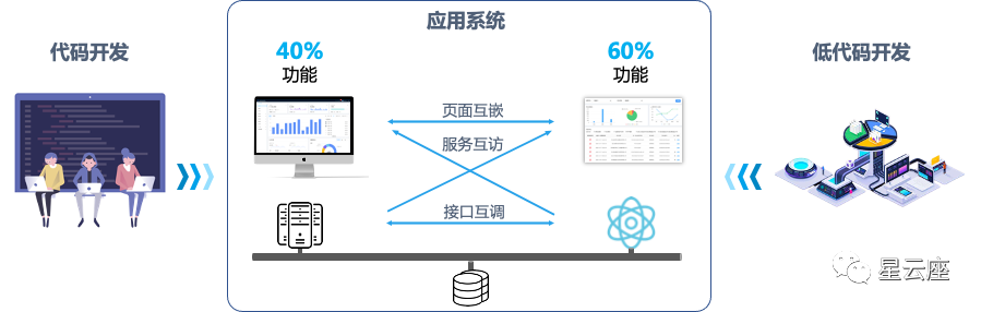 开发人员通过代码编写,完成应用系统的40%的功能开发,项目交付人员通过低代码开发平台完成应用系统60%的功能开发,两部分功能的业务和数据相互打通,前后端功能交叉访问。相互协作组成一套完整的应用系统。既能完成应用系统复杂的业务场景,也能保证项目的开发成本,并且应用系统也具备了低代码扩展能力,便于后期的功能扩展。