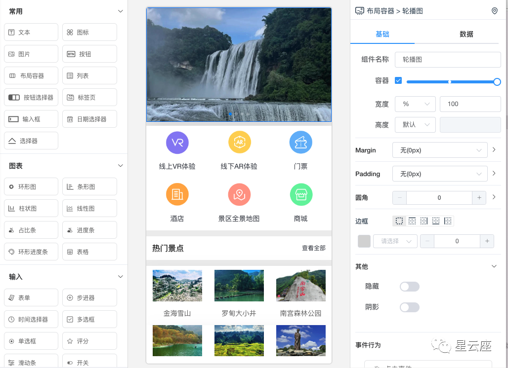 可视化前端页面开发,完备的组件库,支持页面自由布局和功能页面开发,组件样式定义,组件数据配置,事件行为配置。