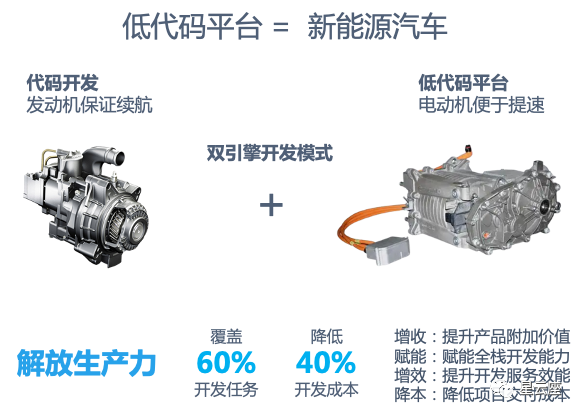 低代码平台就像现在的新能源汽车,技术相对成熟但还没有达到顶峰,考虑到大众的里程焦虑,我们推荐采用双引擎的开发模式,